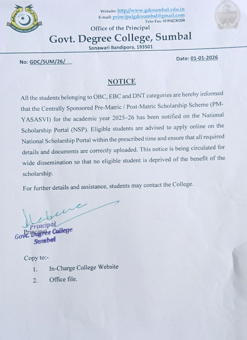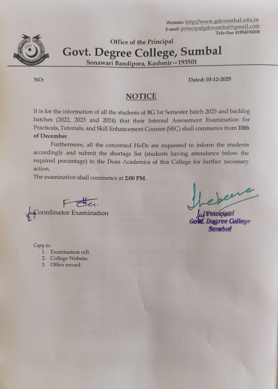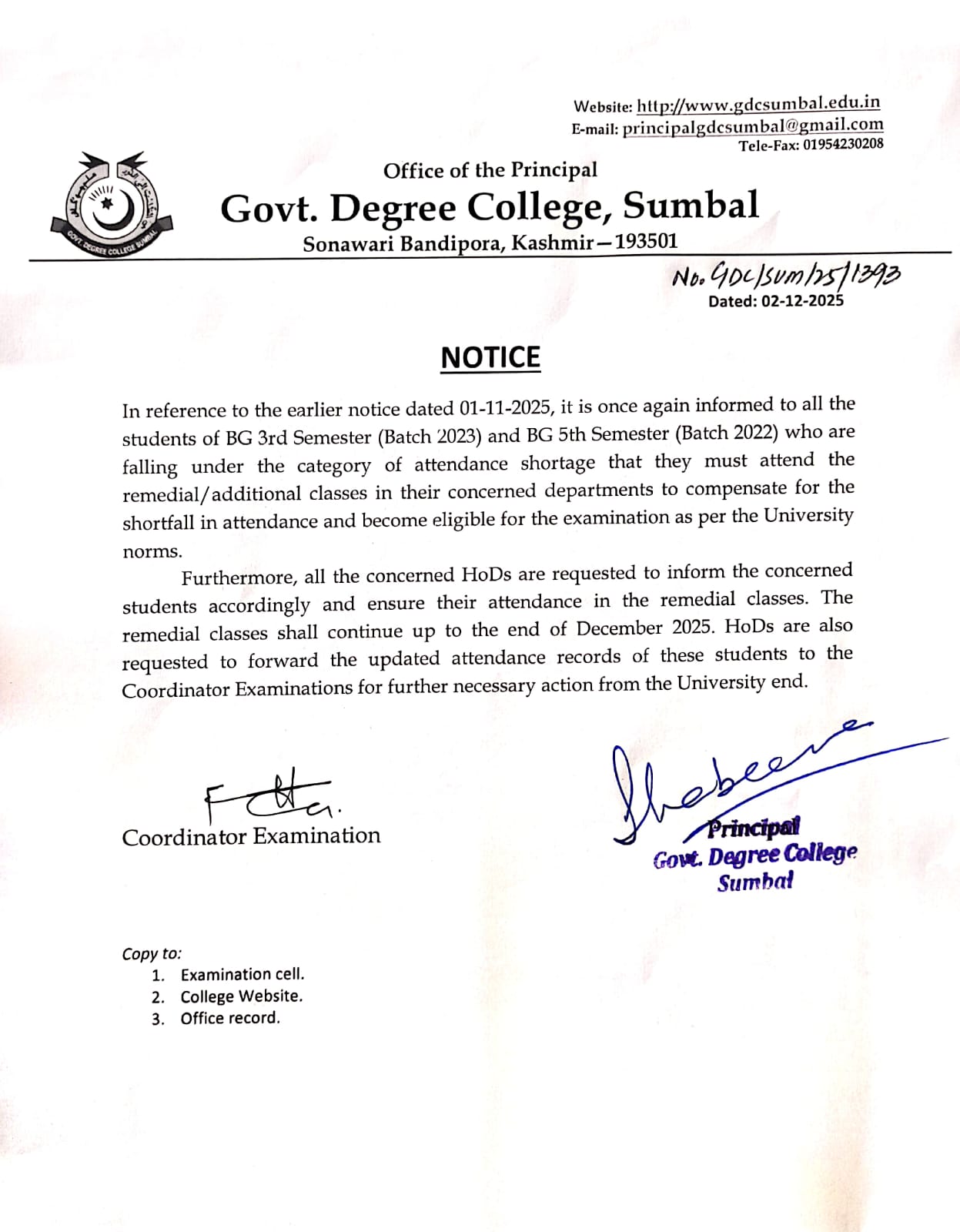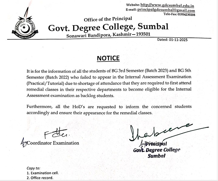 Government Degree College Sumbal was established in 2010 by the Government of Jammu & Kashmir, as per cabinet decision no. 124/08/2010 dated May 12, 2010, and was operationalized by the Department of Higher Education through Government Order No. 229/HE of 2010 dated May 19, 2010. The foundation stone of the main college building was laid by the Honorable Chief Minister on July 7, 2011, and the building was officially inaugurated by the Honorable Minister for Education on October 19, 2014.