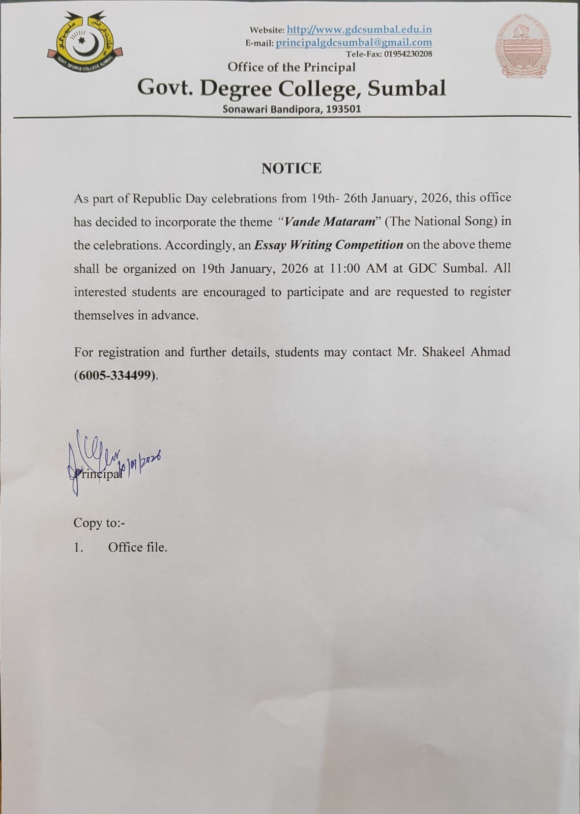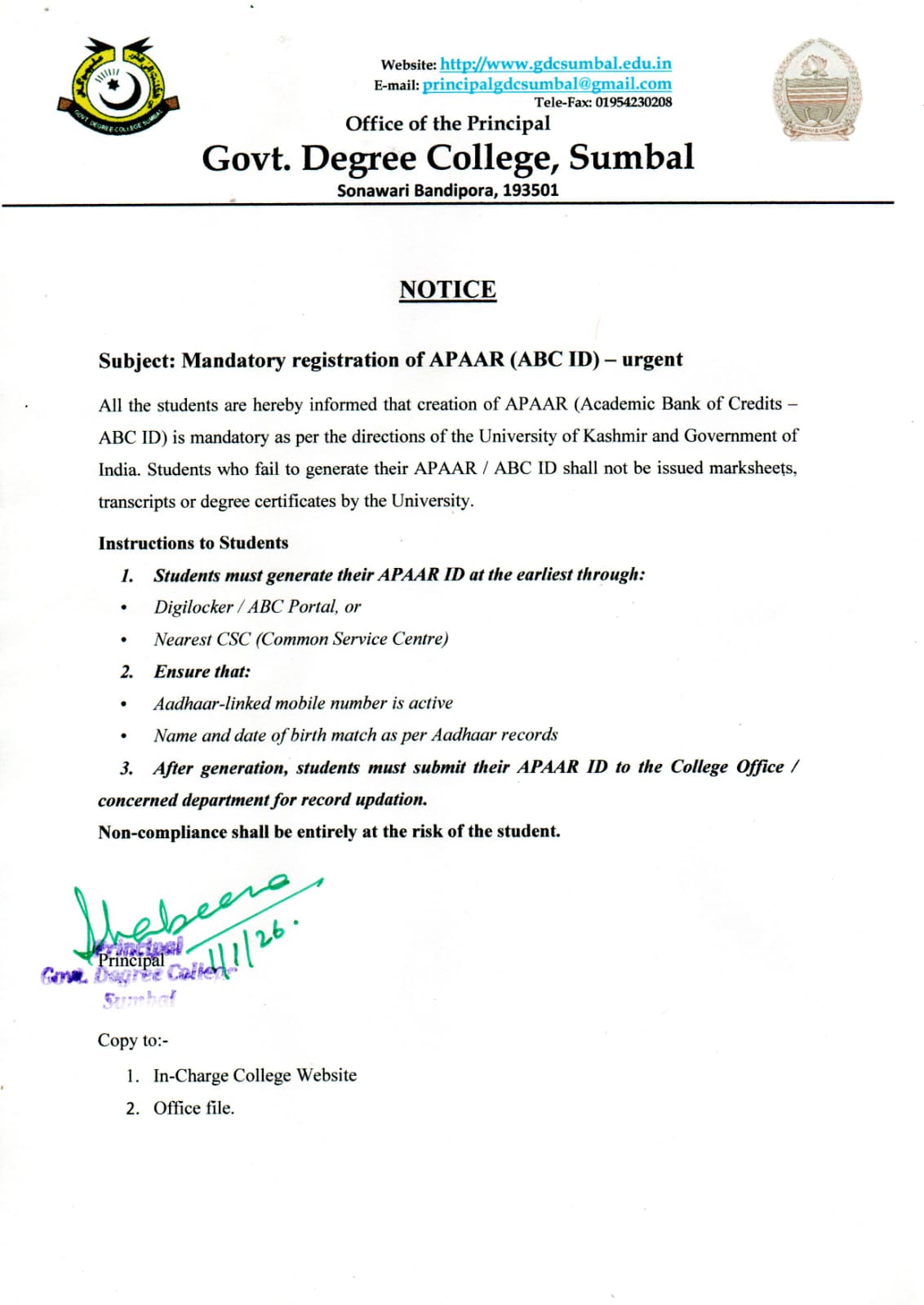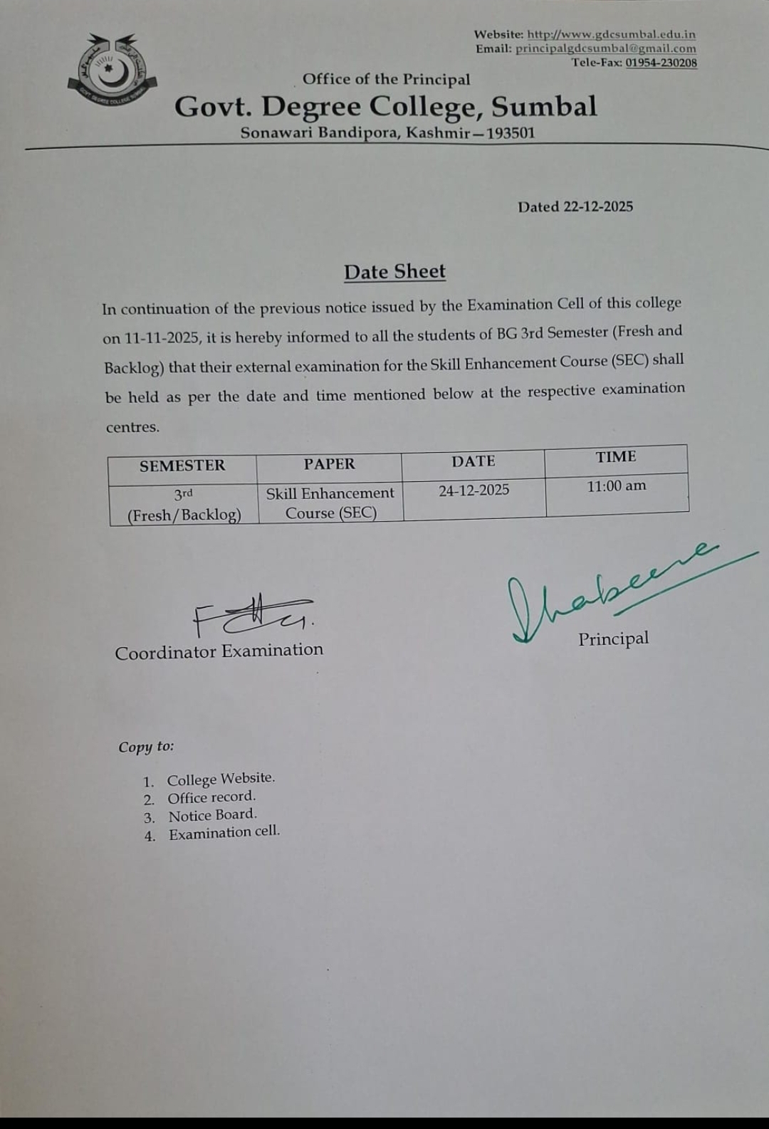 Government Degree College Sumbal was established in 2010 by the Government of Jammu & Kashmir, as per cabinet decision no. 124/08/2010 dated May 12, 2010, and was operationalized by the Department of Higher Education through Government Order No. 229/HE of 2010 dated May 19, 2010. The foundation stone of the main college building was laid by the Honorable Chief Minister on July 7, 2011, and the building was officially inaugurated by the Honorable Minister for Education on October 19, 2014.