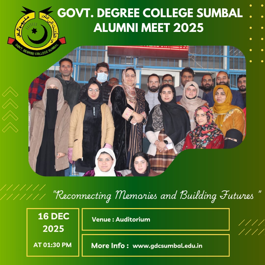 Entrepreneurship Mela on 14th June 2025 Held on: 14 Jun 2025 The District Administration Bandipora, in collaboration with GDC Sumbal, is organizing an Entrepreneurship Mela under MISSION YUVA at GDC Sumbal on Saturday, 14th June 2025. All students and alumni are cordially invited to participate in the event.